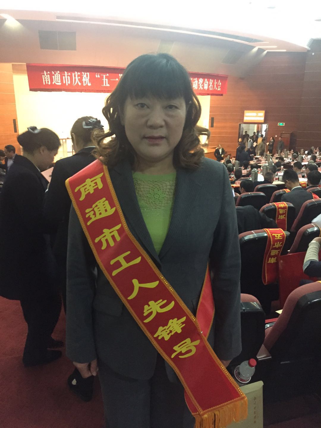 4月28日,在南通市庆祝“五一”国际劳动节暨五一劳动奖命名大会上,江苏业勤服饰有限公司样品车间被授予“南通市工人先锋号”荣誉称号。(图为样品车间代表在大会现场)