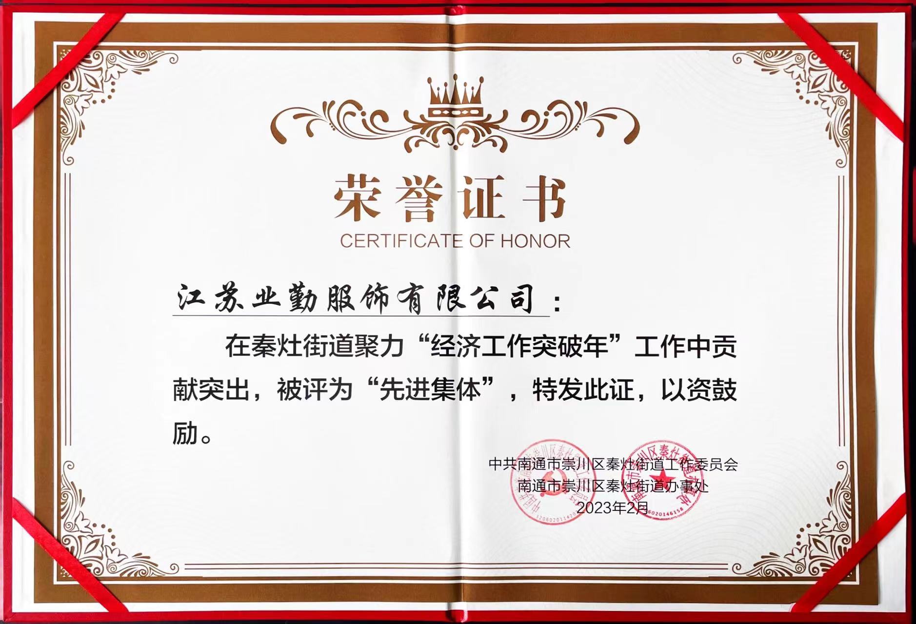 近日,业勤服饰获市北高新区和秦灶街道表彰。公司荣获“2022年度市北高新区高质量发展突出贡献企业”称号、秦灶街道“2022年度突出贡献企业”和“经济工作突破年先进集体”称号。